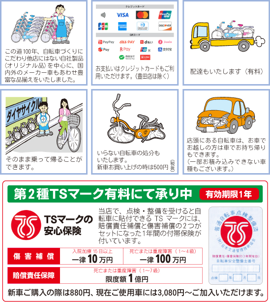 取扱い商品:自転車・シティサイクル・軽快車・折りたたみ車・小径車・マウンテンバイク・クロスバイク・